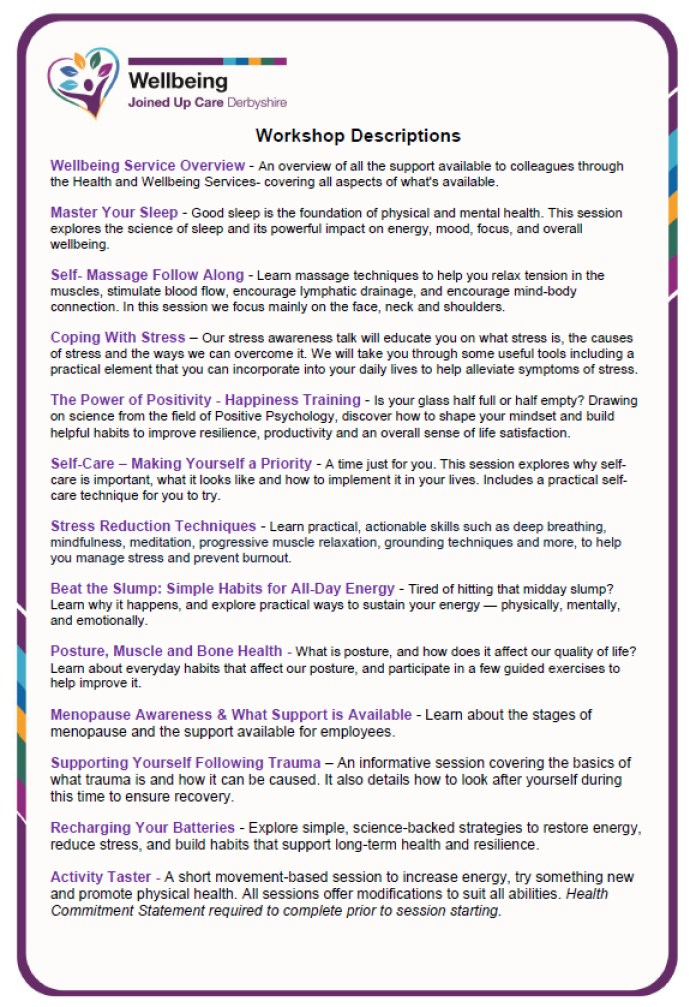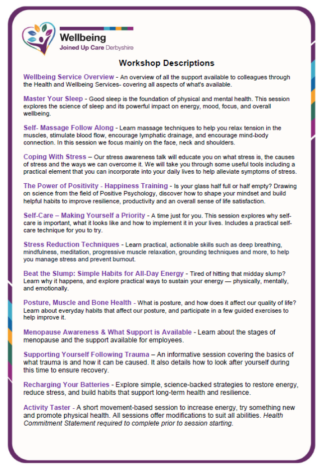 Delivered in collaboration with the Joined Up Care Derbyshire (JUCD) Wellbeing Team, our goal is to help staff access expert guidance, practical tools, and engaging workshops to boost wellbeing in the workplace.