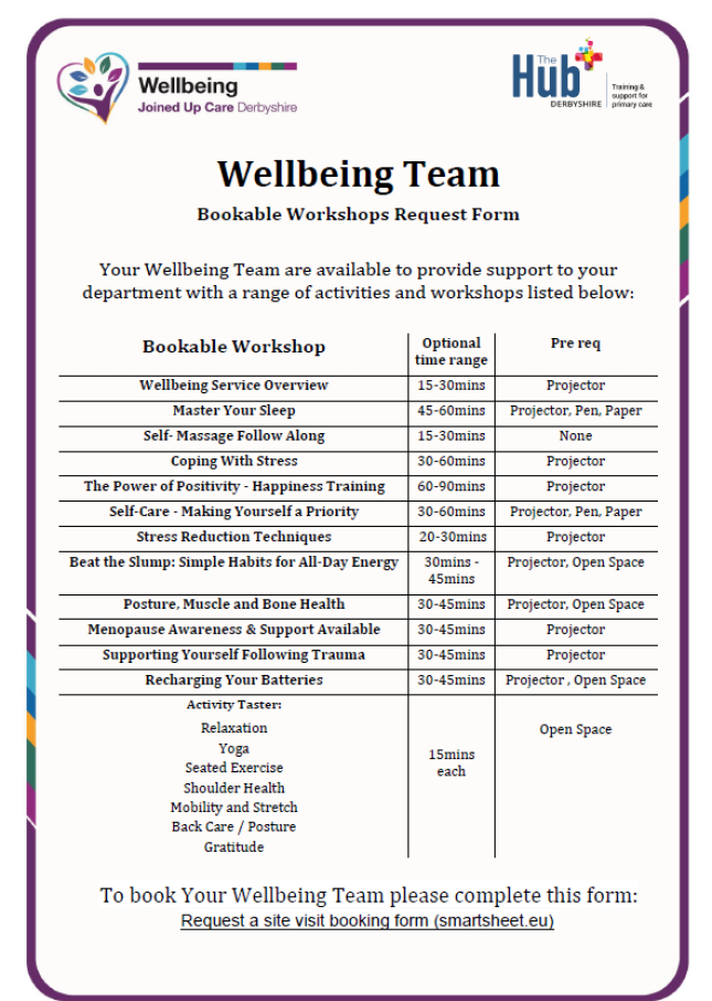 For any wellbeing visits, either click on the above form or complete our online form below. If there is a workshop not listed which you would like to enquire about, please email ddlmc.thehubplus@nhs.net.